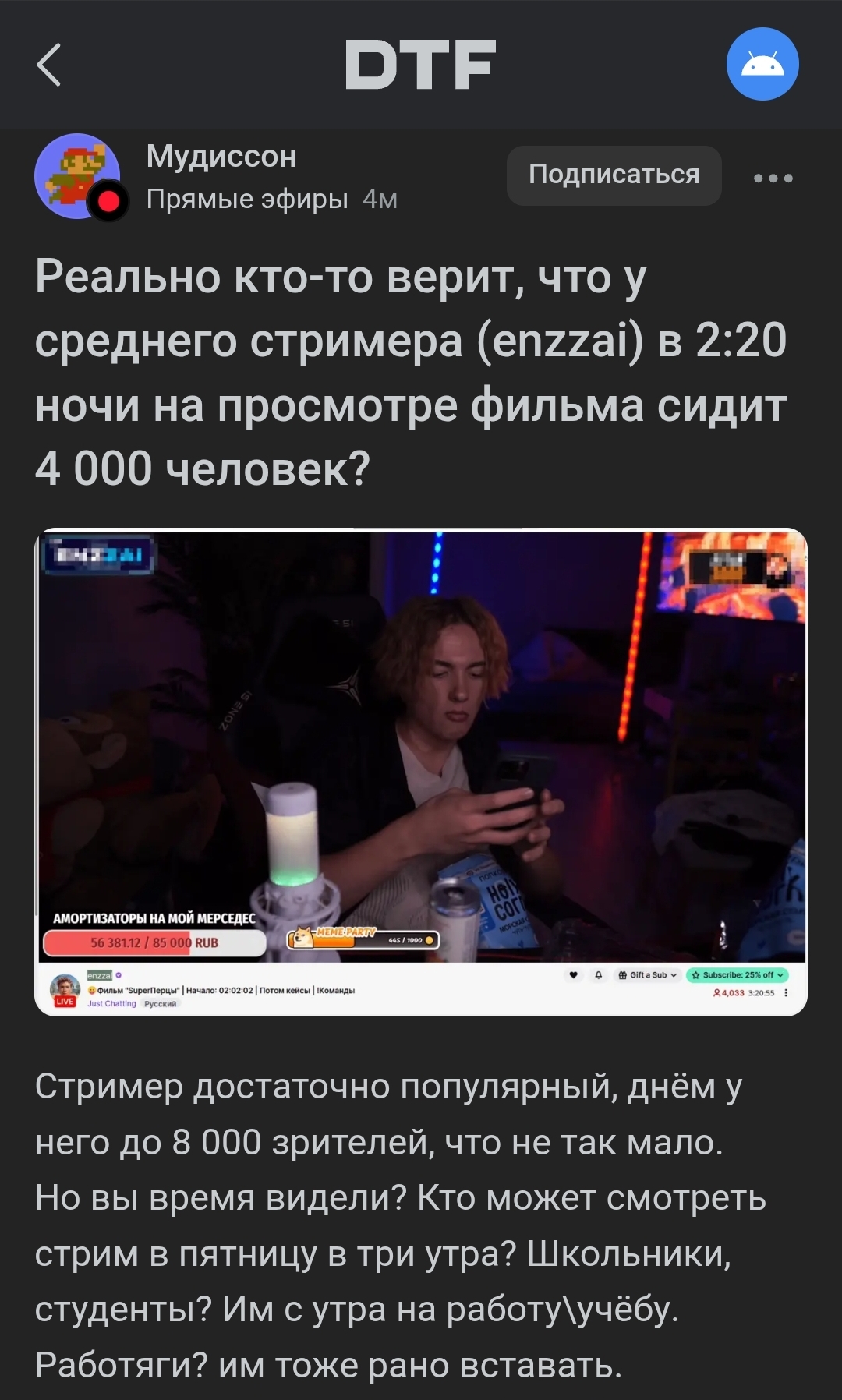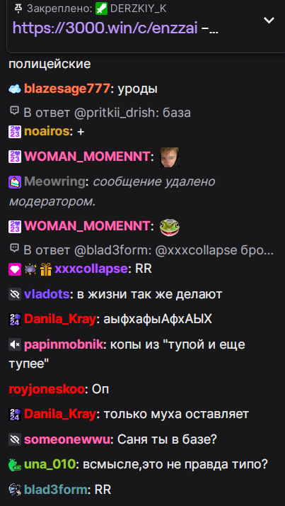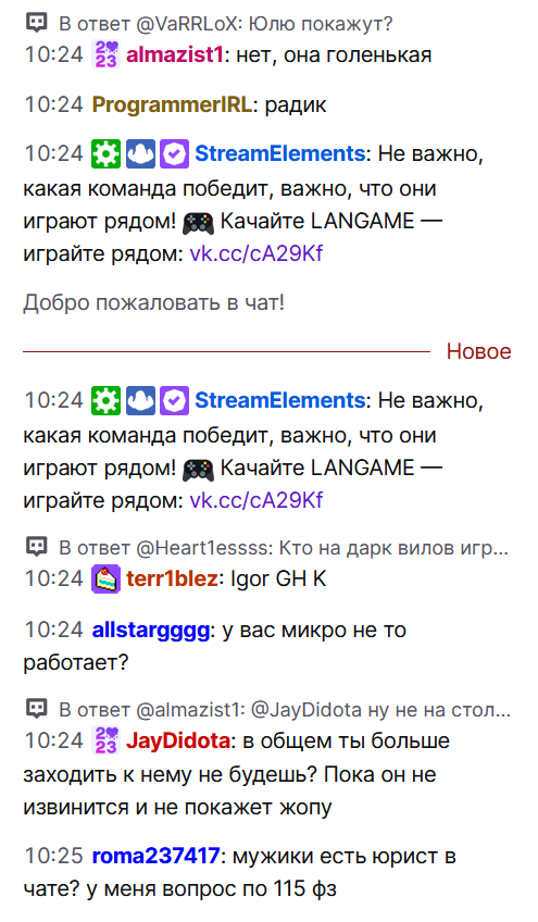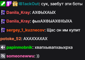 >>25142773 там должен быть таймаут по сообщениям. я не верю что при таком количестве зрилов такой тухлый чат. я когда серегу хел е в 2015 смотрел у него зрилов было 200 человек и чат летел