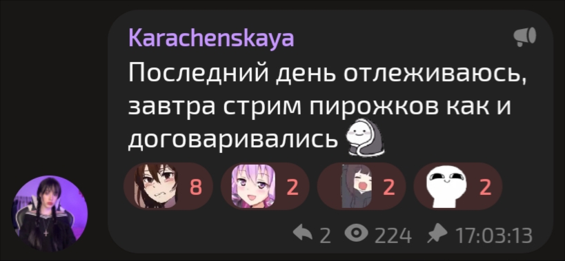 она сознательно отказалась всем этим заниматься где-то пол года назад, до этого были и коллабы и косплеи и какие-то идеи разные. даже не знаю почему ей больше нравится с тремя идиотами общаться 24 на 7, вместо набора новой аудитории