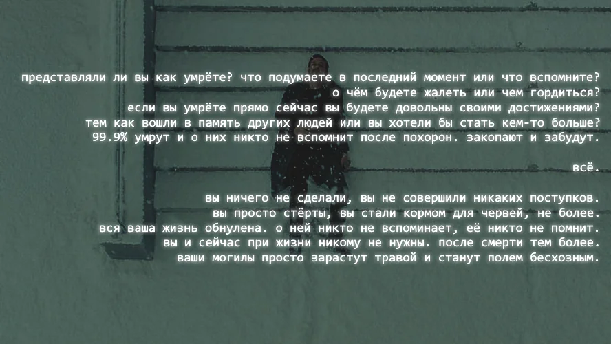 нам часто кажется, что жизнь это надолго, что она чуть ли не вечна, что у нас ещё МНОГО ВРЕМЕНИ, пока не почувствовал дыхание смерти и каждый год это ощущение мимолётности, страх не успеть лишь нарастает и ты думаешь, почему я раньше так бездарно тратил своё время, у меня было столько лет, которые я просто стирал вникуда, а теперь осталось лишь пару лет или даже месяцев и всё