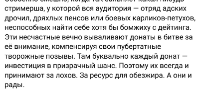 Я до сих пор ору с того, как она описывала переезд в деревню, и СКООООЛЬКО там контента можно сделать. А по итогу походы по одним и тем же местам, аук блять на кличку для собаки, аук на косплей, казик, 4 засвета соска за два месяца, и стримы для дрочеров. Где контент так называемый. Зимой так тем более будет сидеть ауки крутить только