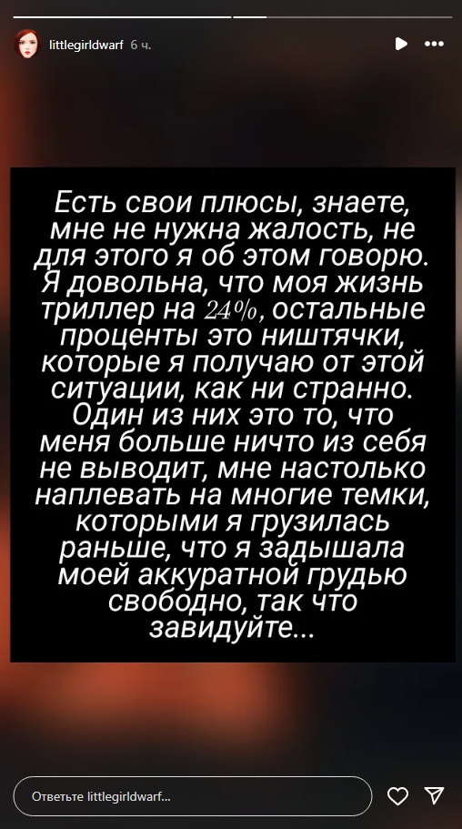 с нетерпением жду каждого стрима или кружочка в телеге чтобы снова услышать её голос и увидеть её прекрасные глаза и улыбку