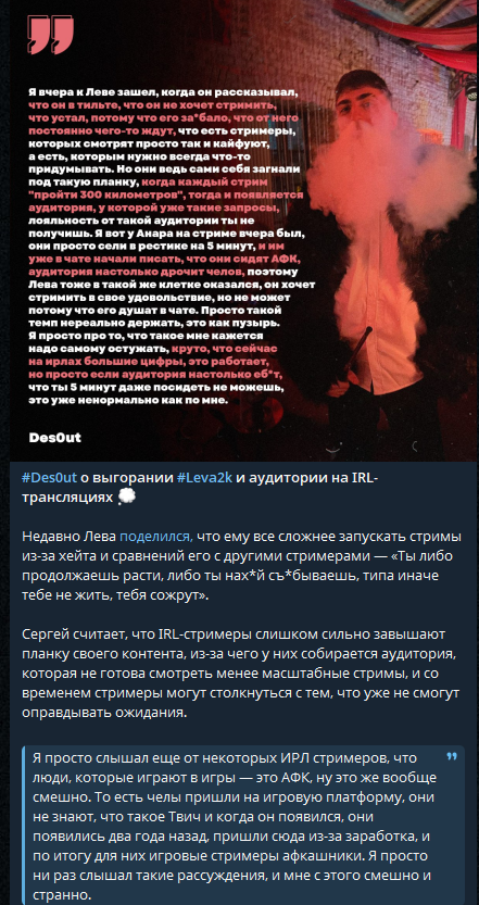 поч не обсуждаем слова гуру стриминга? Чел буквально сидит в зоне комфорта,никогда не стремился идти вверх,как вот подтянула Наташка в компанию,он так и сидит просто хуй знает есть он или нет вообще и чёт ещё обсуждает типов по типу Анала и Лева