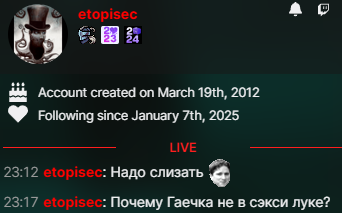 >>25187591 да там его еле слышно было. а так просидел фулл ее стрим с самого начала и до конца. в кс с ней не пошел, но почти сразу в дс зашел к ним, потом даже когда срать пошел, то не ливнул и с телефона зашел и пиздел. Лера его подъебывла, что он только на ее вебку смотрит, ну вот это было >>25185649