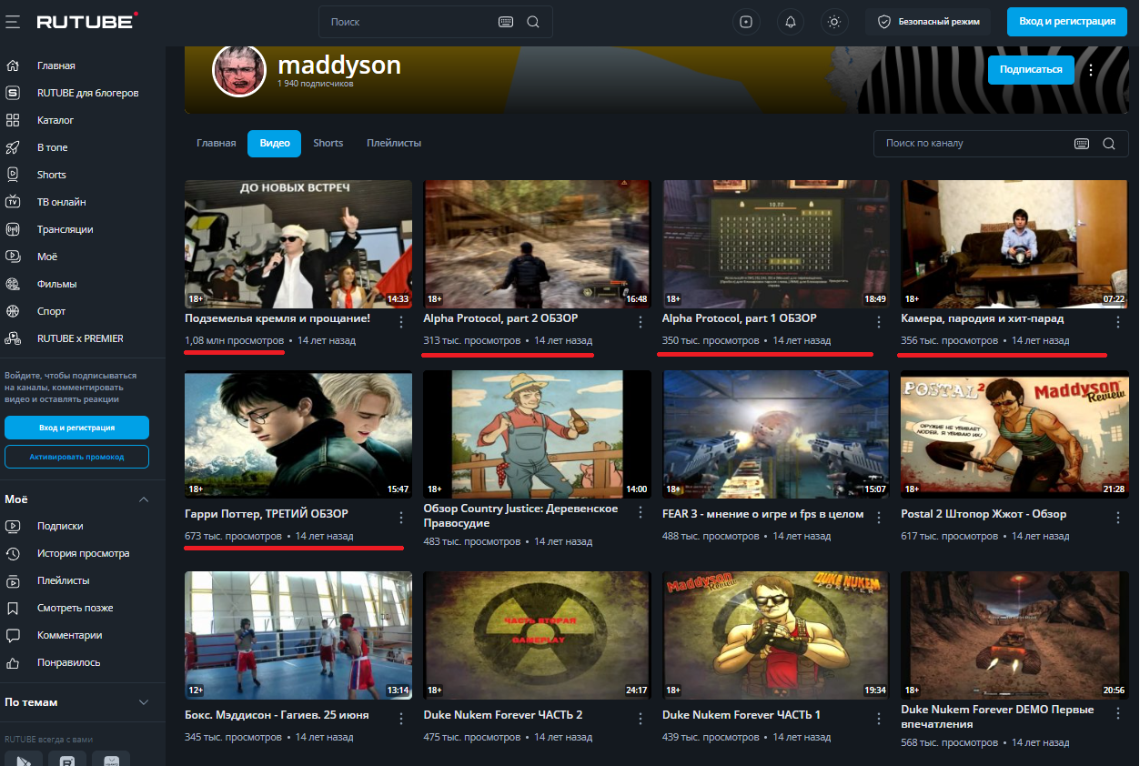 Анон, помнишь откуда Мэддисон начинал? С Рутуба в 2008 году. У него по прежнему остался канал на Рутубе где он 17-16 лет назад выкладывал свои первые видосы https://rutube.ru/channel/12064/videos/