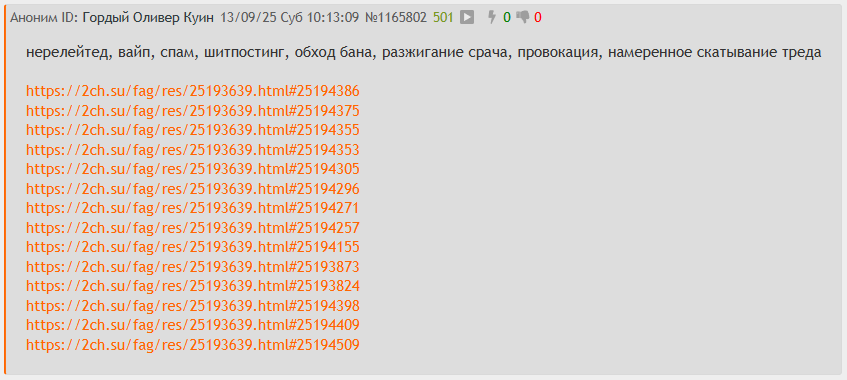 Вайп, скатывание треда, разжигание ненависти, обход бана, нерелейтед, есть свой загон.