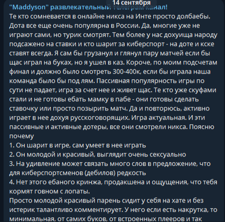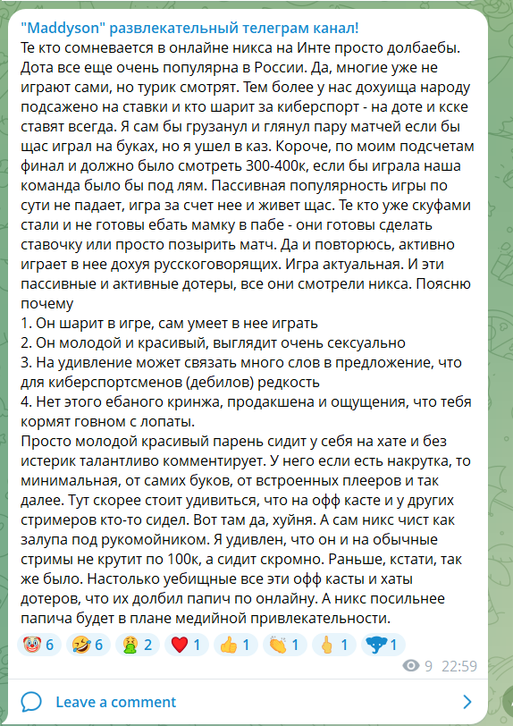 Те кто сомневается в онлайне никса на Инте просто долбаебы. Дота все еще очень популярна в России. Да, многие уже не играют сами, но турик смотрят. Тем более у нас дохуища народу подсажено на ставки и кто шарит за киберспорт - на доте и кске ставят всегда. Я сам бы грузанул и глянул пару матчей если бы щас играл на буках, но я ушел в каз. Короче, по моим подсчетам финал и должно было смотреть 300-400к, если бы играла наша команда было бы под лям. Пассивная популярность игры по сути не падает, игра за счет нее и живет щас. Те кто уже скуфами стали и не готовы ебать мамку в пабе - они готовы сделать ставочку или просто позырить матч. Да и повторюсь, активно играет в нее дохуя русскоговорящих. Игра актуальная. И эти пассивные и активные дотеры, все они смотрели никса. Поясню почему 1. Он шарит в игре, сам умеет в нее играть 2. Он молодой и красивый, выглядит очень сексуально 3. На удивление может связать много слов в предложение, что для киберспортсменов (дебилов) редкость 4. Нет этого ебаного кринжа, продакшена и ощущения, что тебя кормят говном с лопаты. Просто молодой красивый парень сидит у себя на хате и без истерик талантливо комментирует. У него если есть накрутка, то минимальная, от самих буков, от встроенных плееров и так далее. Тут скорее стоит удивиться, что на офф касте и у других стримеров кто-то сидел. Вот там да, хуйня. А сам никс чист как залупа под рукомойником. Я удивлен, что он и на обычные стримы не крутит по 100к, а сидит скромно. Раньше, кстати, так же было. Настолько уебищные все эти офф касты и хаты дотеров, что их долбил папич по онлайну. А никс посильнее папича будет в плане медийной привлекательности.