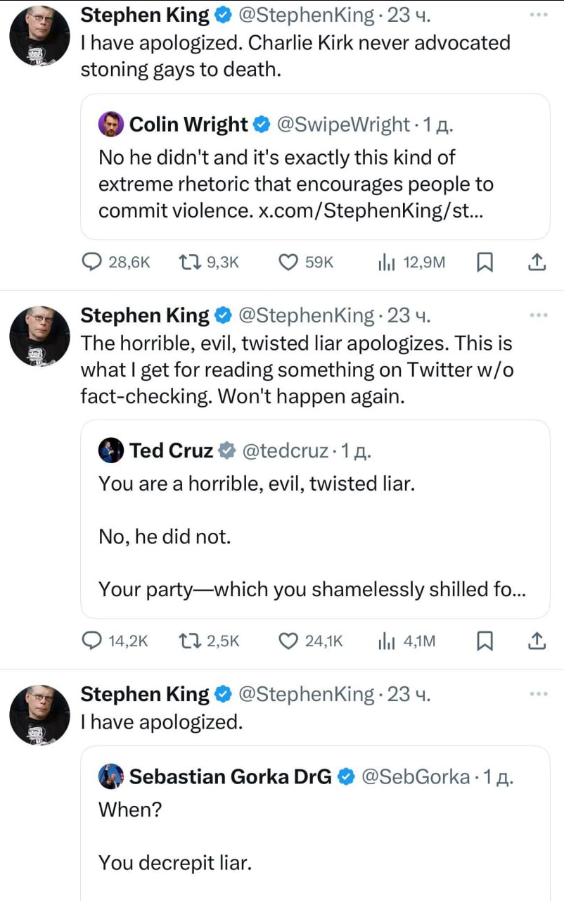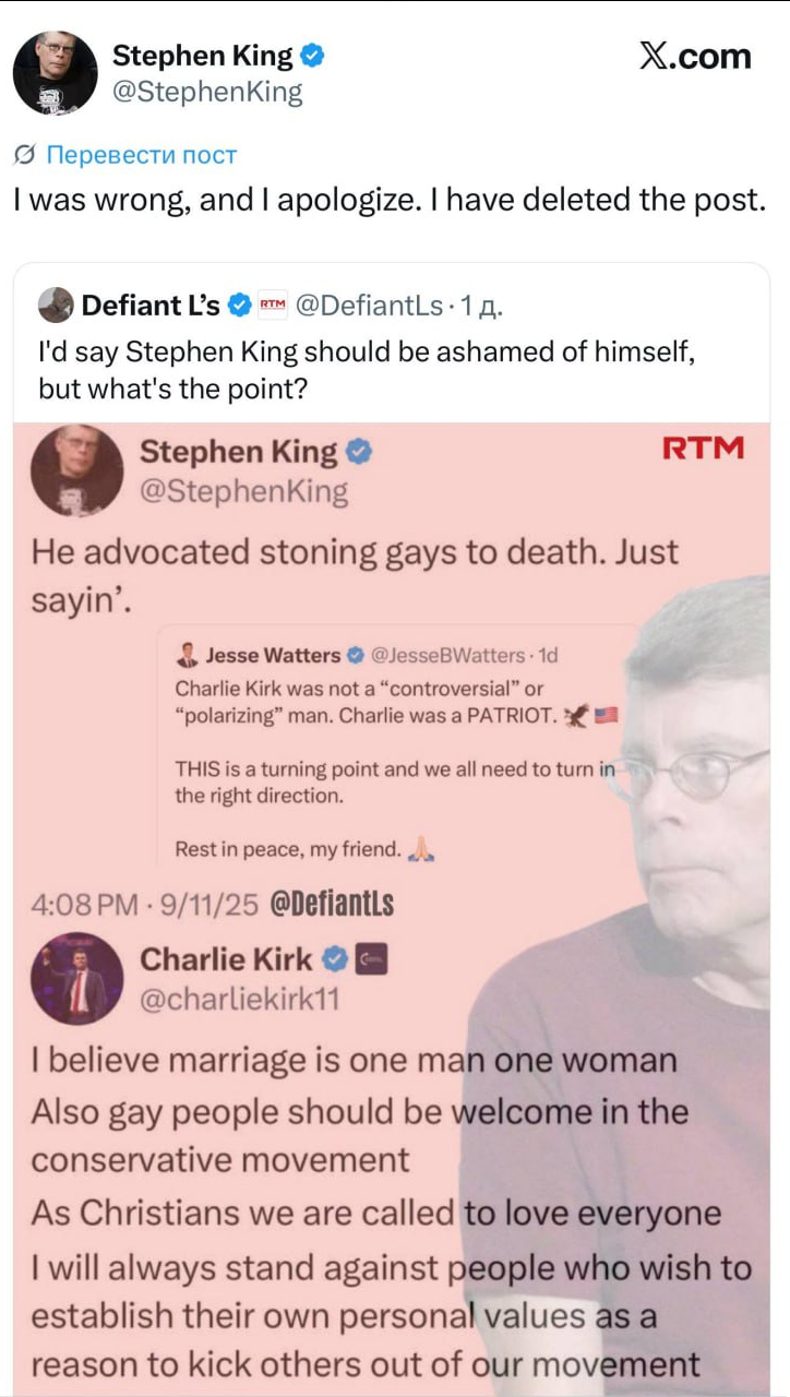 Стивена Кинга массово отменяют. Писатель заявил, что застреленный Чарли Кирк призывал «забивать геев камнями». Кингу быстро ответили, что Чарли Кирк никогда такого не говорил. Осознав, что он может столкнуться с миллионными исками за клевету, Кинг удалил пост, начал в панике извиняться и написал, что такого больше никогда не повторится.