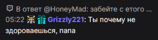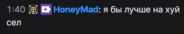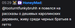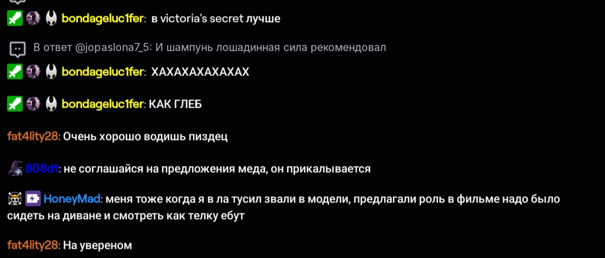 Хули жопич свой рот разевает на шизю. У самого анальная модерация в ссаном твиче была, бан за любую хуйню, чат только для сабов-чемоданов, закрытая клетка, донат никогда на экран не выводился и не озвучивался чтобы лишний раз не унижали бля.