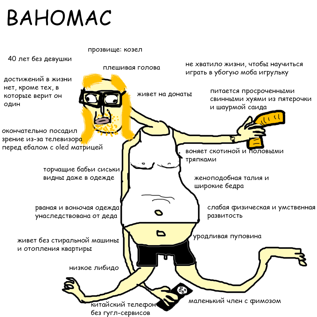 VANOMAS (он же Иван Маслаков, Посраков, Пасра, Пасрак, Вислопис, Бомж, Козлиец, Посрамас, Ванограз, Попрошайкин, Кишечная Трубка) — российский фрик нижнего интернета, стример и обзорщик видеоигр, автор геполитической аналитики, создатель философии разумизма, лицемерный шиз с запредельной тупизной и бредом величия, ненавидящий всех и эпично проебывающий собственную жизнь в засранной нищей маслушке, за чем мы все с удовольствием и наблюдаем. Родился 9 февраля 1984 года и подбирается к самому пиздецу.
