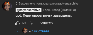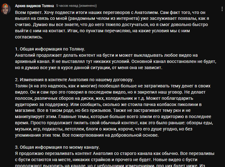 >>25221440 Сентябрьские соглашения подписаны сторонами. Анатолий получает право на бронирование одного дня для публикации видео, а архив ввел санкции на видео с манипулированием РКН и отключил просительную систему, а также получил право на разработку видео с Толяном 50 на 50.