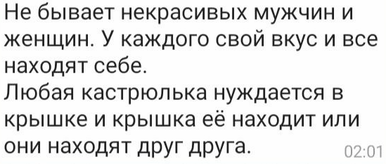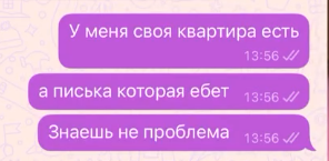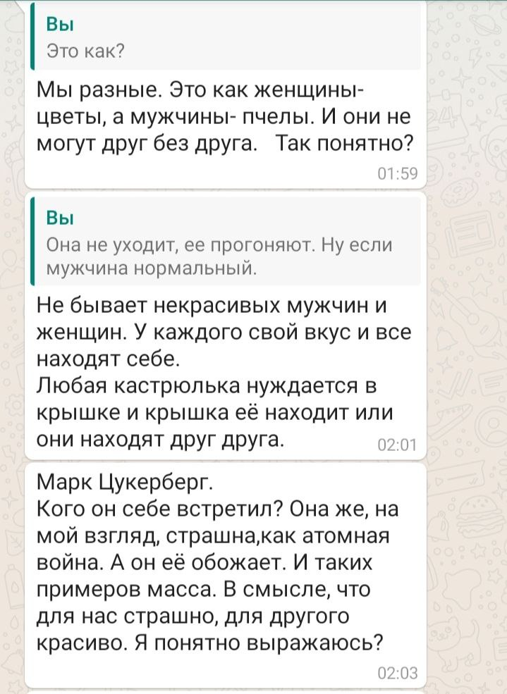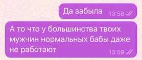 >>25220388 Шалава хоть бы постеснялась переписку выкладывать. Мужик с ней культурно говорит в переписке, а она его матом кроет, обсирает, говорит: "А у твоих нормальных знакомых жёны даже не работают", "Женщине член найти не проблема". Ещё и залетела до свадьбы.