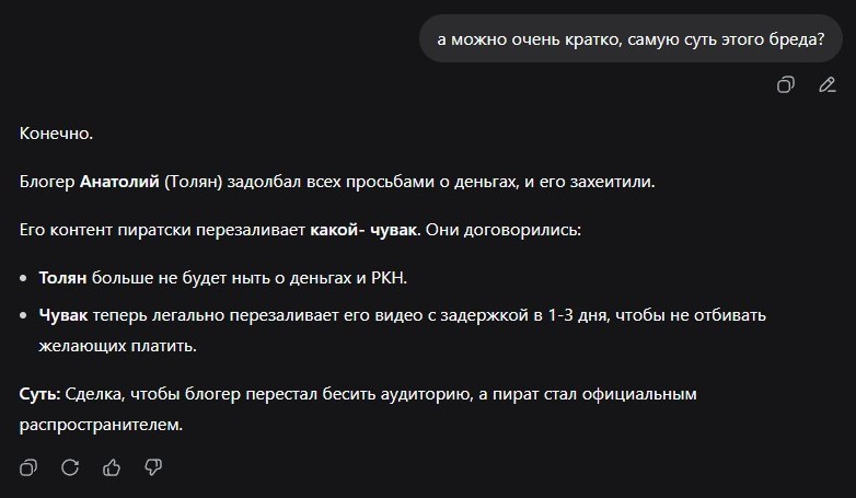 >>25220185 Капец. Толя напоминает Пыню, которого, также прогибают. Подписал сентябрьские соглашения и по сути на нем санкции в виде запрета клянчить деньги и манипуляции РКН, так ещё совместная разработка контента. Гениально.