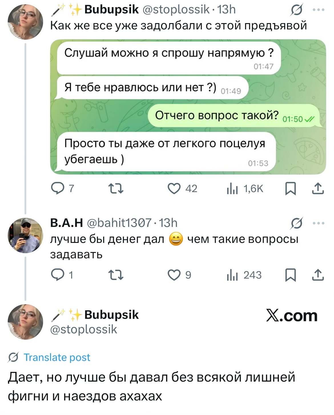 >>25226281 у неё мать жёсткая хабалка. ей думаю абсолютно пофиг с кем её дочь главное чтобы сьебала с квартиры. она её постоянно по поводу работы пилила. по поводу америкоса так ты давно канал не смотрел видимо. она уже успела побывать с другим челом в отношениях который ей секс не давал и она плакалась по этому поводу.