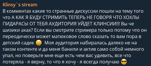 Бля, клизми, реально заебала уже, подрубай на кике, сучка, почему мы должны ждать стрима по две+ недели только из-за того, что тебя там видите ли забанили, ну ты о нас подумай хоть немного, а.