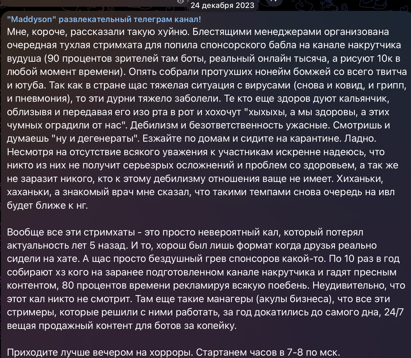 тем временем канал чмодья на твиче и кике не забанен, а братишкин не набутылен за додж налогов. Понравилась вам сценка от Ильи Мэддисона и Дианочки, да?
