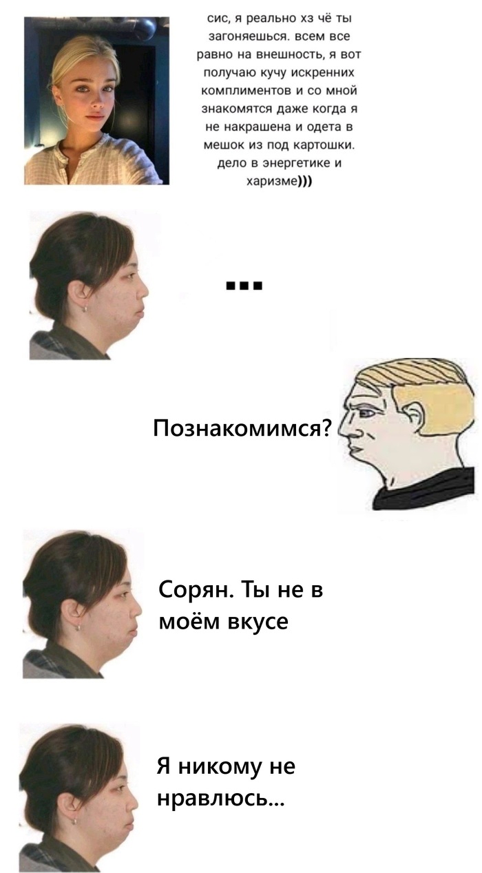 Встречал бабу на православных знакомствах, симпатичную. В 2020 году искала врача в православных пабликах, мне в ЛС, даже не ответила. В 2021 увидел ее анкету, искала военного врача или просто военного. Сейчас ее анкета - просто ищу собеседника, "плевать, даже если ты дворник". С этого я ввизгнул знатно.