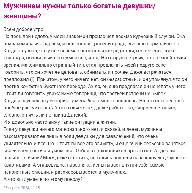 бля, я неиронично до сих пор неженат потому что у моих девушек (3 за 15 лет) не было за спиной нихуя все предлагали ипотеку, еще какую нить хуйню со снятием, одна ваще была нищенкой из коммуналки блять если бы хоть одна из них была с квартирой, я бы на колено с кольцом стал без сомнений но тут реально 30 лет ипотеку на горбу тащить не хочется нихуя