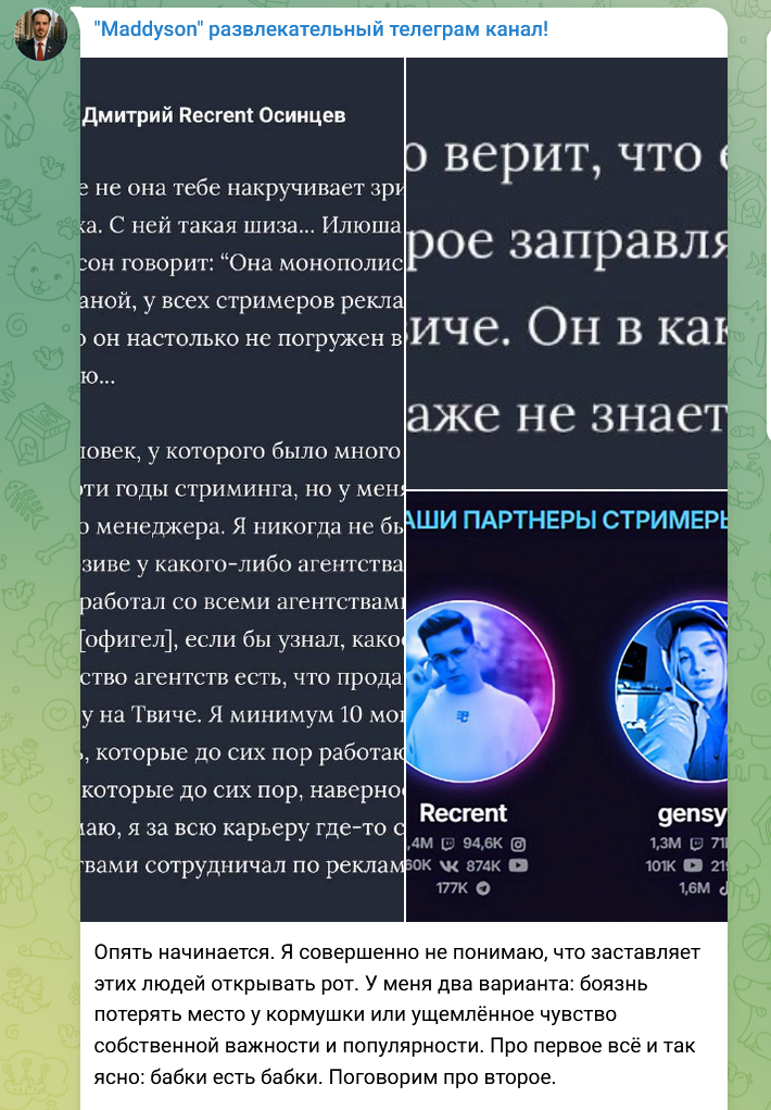 Те, кто умнее, — они просто молчат. Они всё прекрасно понимают и видят. Но, как и все остальные, в глубине души верят: «Ну как же так-то, блядь? То есть я вот стримлю на столько человек, а это всё боты? Да не, не может быть, просто я хороший популярный стример, который всего добился сам».