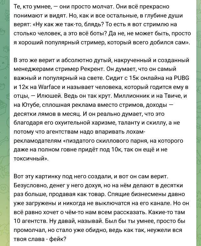 В это же верит и абсолютно дутый, накрученный и созданный менеджерами стример Рекрент. Он думает, что он самый важный и популярный на свете. Сидит с 15к онлайна на PUBG и 12к на Warface и называет человека, который годится ему в отцы, — Илюшей. Ведь он так крут. Миллионник и на Твиче, и на Ютубе, сплошная реклама вместо стримов, доходы — десятки лямов в месяц. И он реально думает, что это благодаря его охуительной харизме, таланту и скиллу, а не потому что агентствам надо впаривать лохам-рекламодателям «пиздатого скиллового парня, на которого даже на полном говне придёт под 10к, так он ещё и не токсичный».