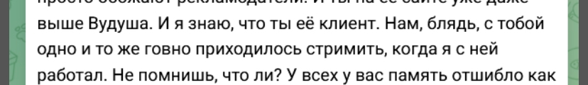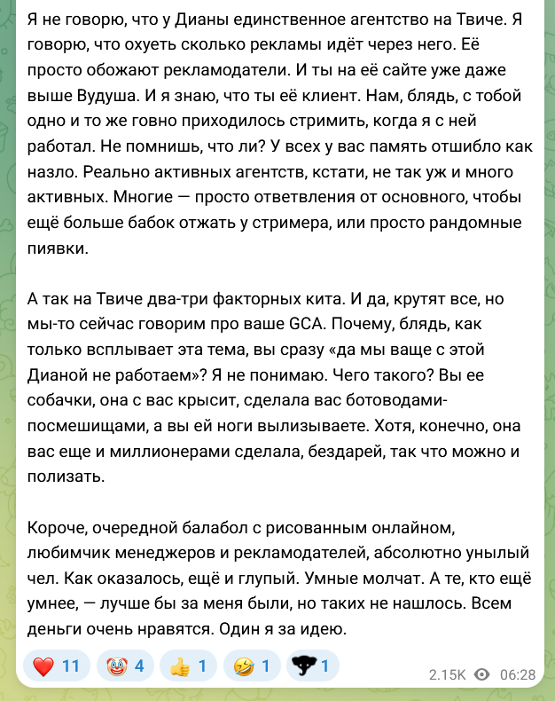 Я не говорю, что у Дианы единственное агентство на Твиче. Я говорю, что охуеть сколько рекламы идёт через него. Её просто обожают рекламодатели. И ты на её сайте уже даже выше Вудуша. И я знаю, что ты её клиент. Нам, блядь, с тобой одно и то же говно приходилось стримить, когда я с ней работал. Не помнишь, что ли? У всех у вас память отшибло как назло. Реально активных агентств, кстати, не так уж и много активных. Многие — просто ответвления от основного, чтобы ещё больше бабок отжать у стримера, или просто рандомные пиявки.
