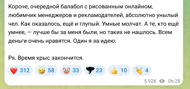 Короче, очередной балабол с рисованным онлайном, любимчик менеджеров и рекламодателей, абсолютно унылый чел. Как оказалось, ещё и глупый. Умные молчат. А те, кто ещё умнее, — лучше бы за меня были, но таких не нашлось. Всем деньги очень нравятся. Один я за идею.