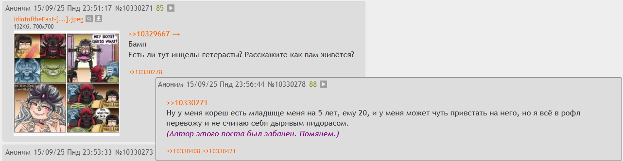 Опять начесали, пока я на работе был, дохера интересного чешете без меня, а щас перекатите, и снова говно будет! Твари! Постоянно перекаты ебучие как с работы прихожу и пожру, ну, благо щас не успели насрать ещё 200 постов в новом треде