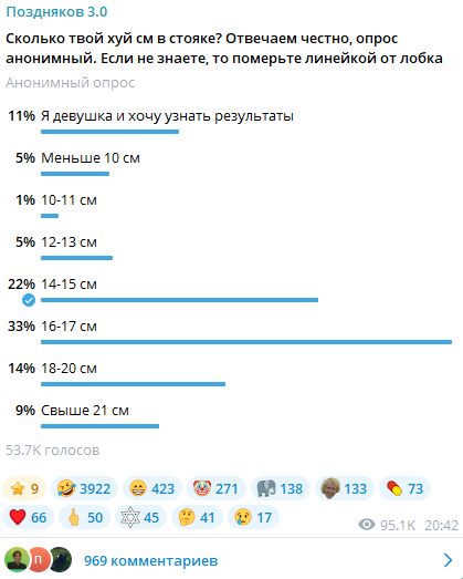 >>25248717 Пиздаболы даже в анонимном опросе бояться правду сказать. Хуй 16см уже как у порноактёра, можно в порно сниматься, у многих негров на деле такой размер, решает толщина и ракурс. А средний размер 13см где-то.