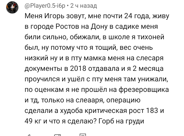 >>25251419 Напишите ему про фаг, чел хочет чтобы его услышали, сколько такие еще горемык не знают где выговориться...кстати рост и вес у меея такими же были 50 кг при 188 росте, он еше наберёт