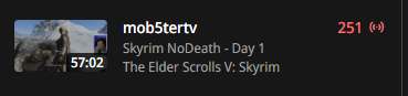 https://www.twitch.tv/mob5tertv Skyrim No Death Challenge | День 1 😐 Правила и суть: У меня есть ограниченное число жизней. За каждые 10 смертей (цифра может меняться по ходу) запускается колесо наказаний/бонусов. На колесе: от мелких штрафов и временных ограничений до суровых испытаний — например, полный сброс или обнуление персонажа или его навыков. Некоторые эффекты действуют по таймеру, а некоторые — навсегда до конца трая / стрима. 🫶 Список наказаний и бонусов я не раскрываю — будет сюрприз! ‼️ Важно: правила могут усложняться или дополняться по ходу стрима, но никогда не упрощаться.