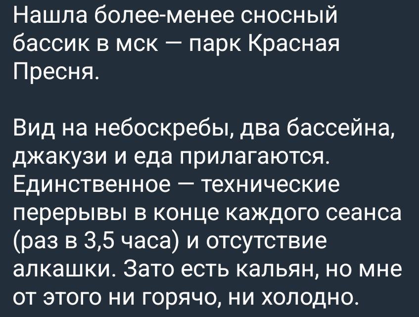>>24971717 Что за манера такая ЧСВ-шная писать в режиме обзорщика-эксперта "нашла более-менее", типа ты завсегдатай бассейнов, объездила все подмосковье и вот "нашла" и поделилась с убогими. Когда в пятерочке купит что-то тоже будет писать "наконец нашла сносные пельмени в Москве"?