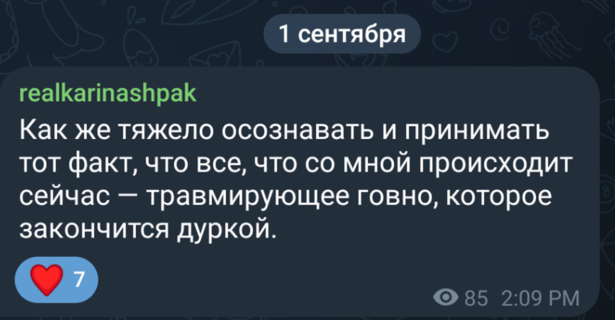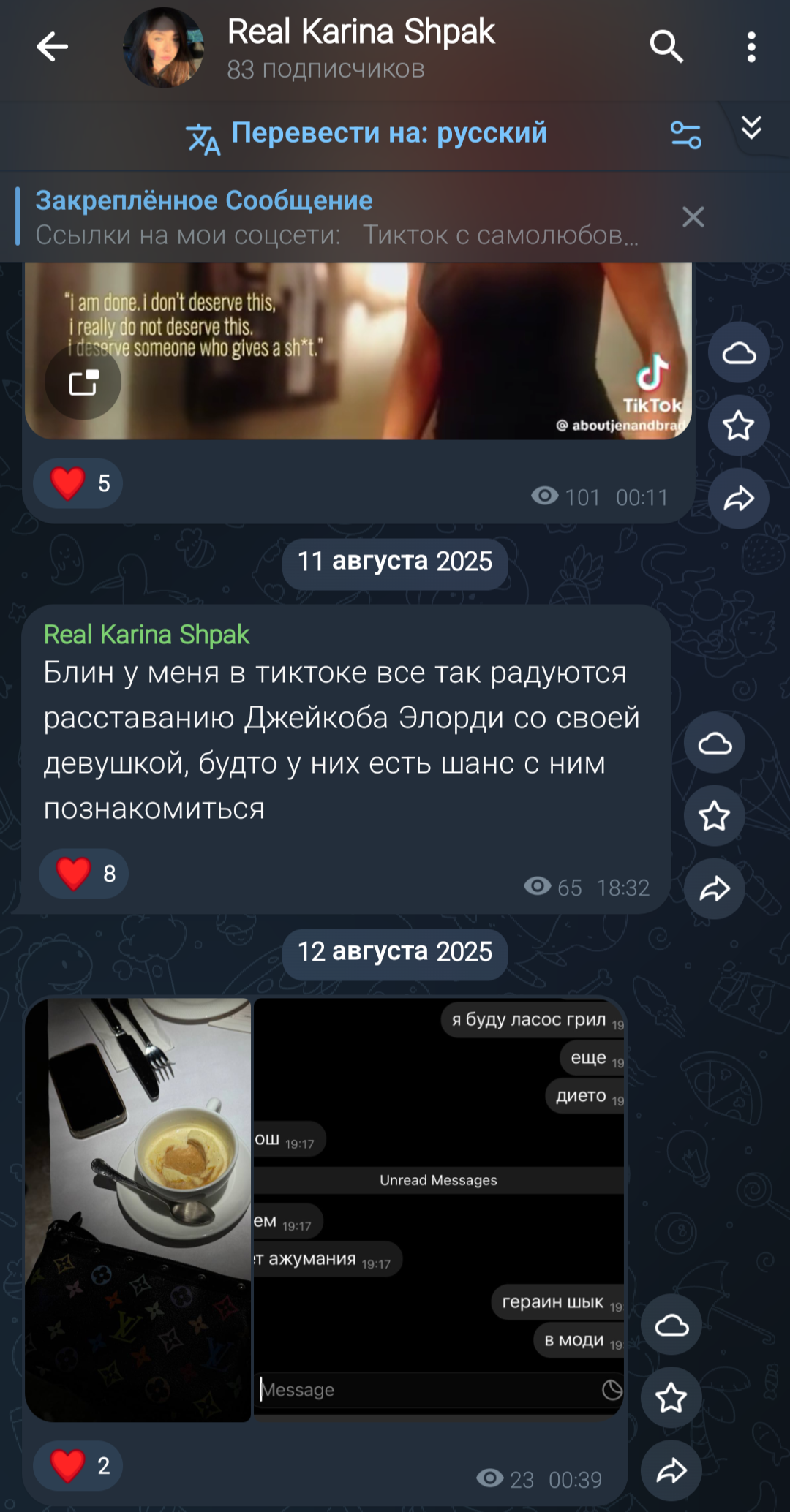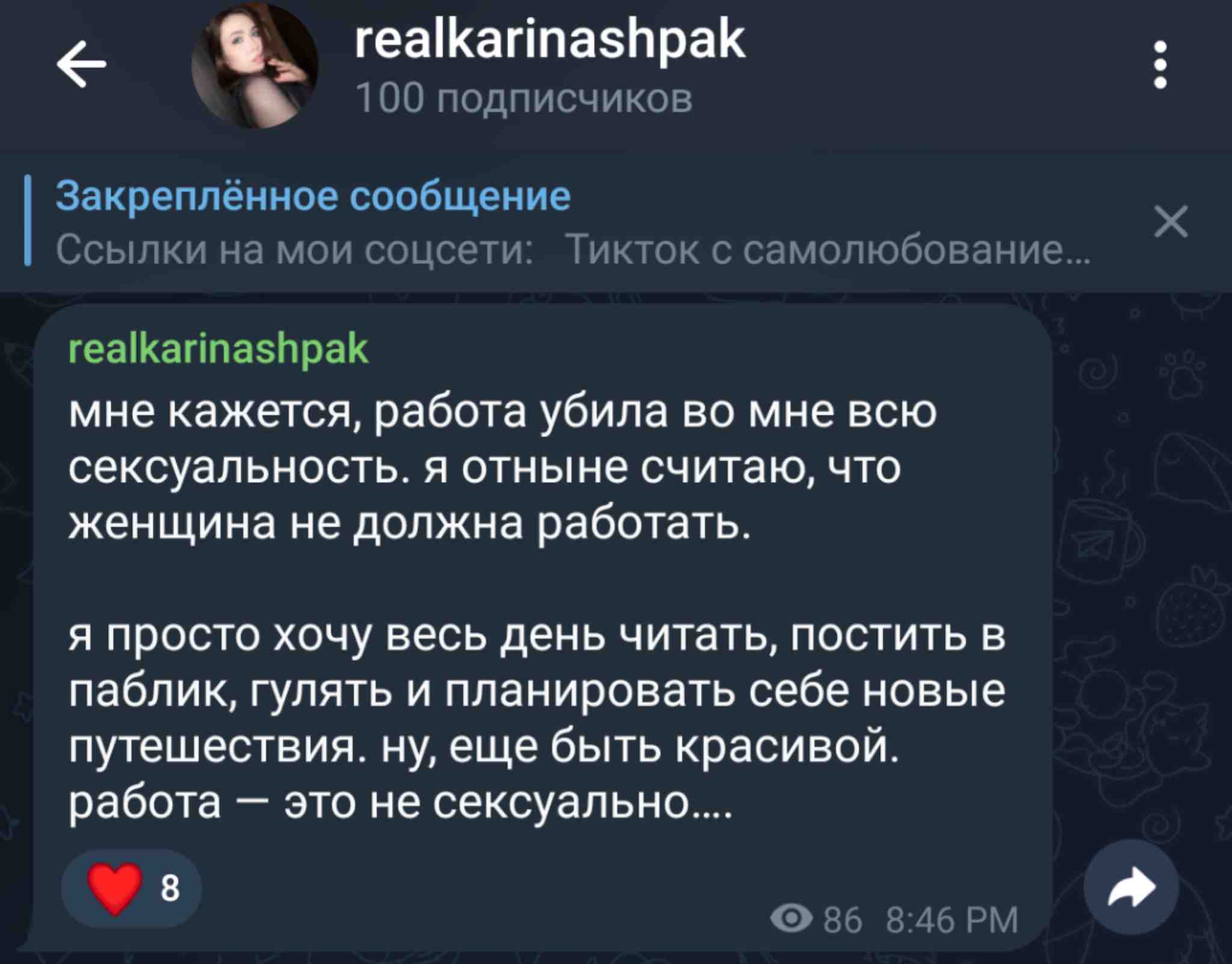 Почему Карина Шпак снова так мало постит про себя в своем тг канале? Что-то случилось? А может завал на работе? Или уехала путешествие на медовый месяц с Тохой Резновым?
