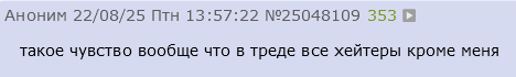>и причем эта настя вообще Я просто от скуки начал ее хейтить несколько тредов назад. То ли сам начал, то ли присоединился к парочке анонов, которые уже этим занимались, даже не помню уже. Но в ответ увидел чей-то бугурт, заметный такой. А потом мне вдруг практически на ровном месте кто-то показал мои посты в старых тредах, намекая на диванон. В ответ на пост, в котором всего три слова, то есть из него нельзя определить стиль. И в тех тредах никакая дискуссия не начиналась с подобных слов. То есть, связи между постами вообще никакой.