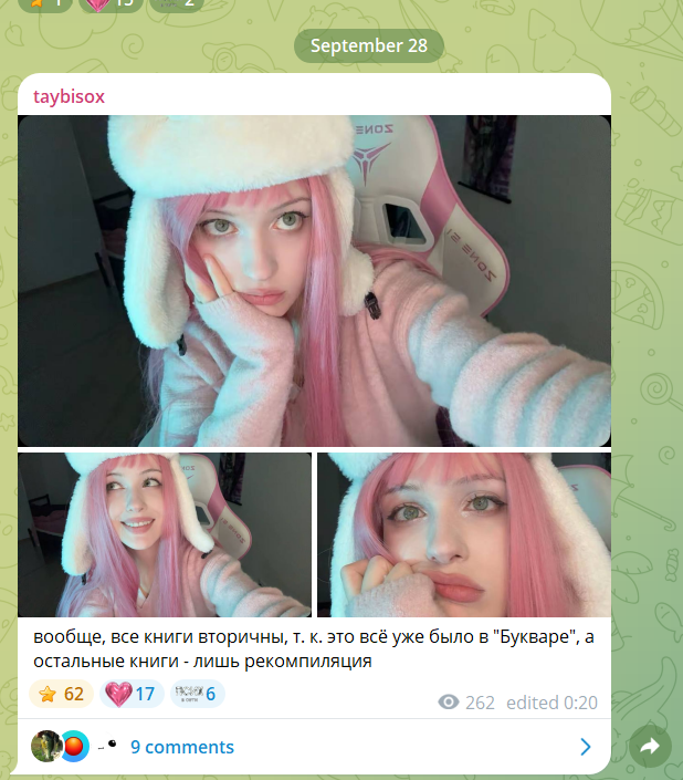 Настю начал хейтить чисто по фану несколько дней назад. В ответ увидел чей-то бугурт, может ебарь ее, а не она сама. А теперь вот это.