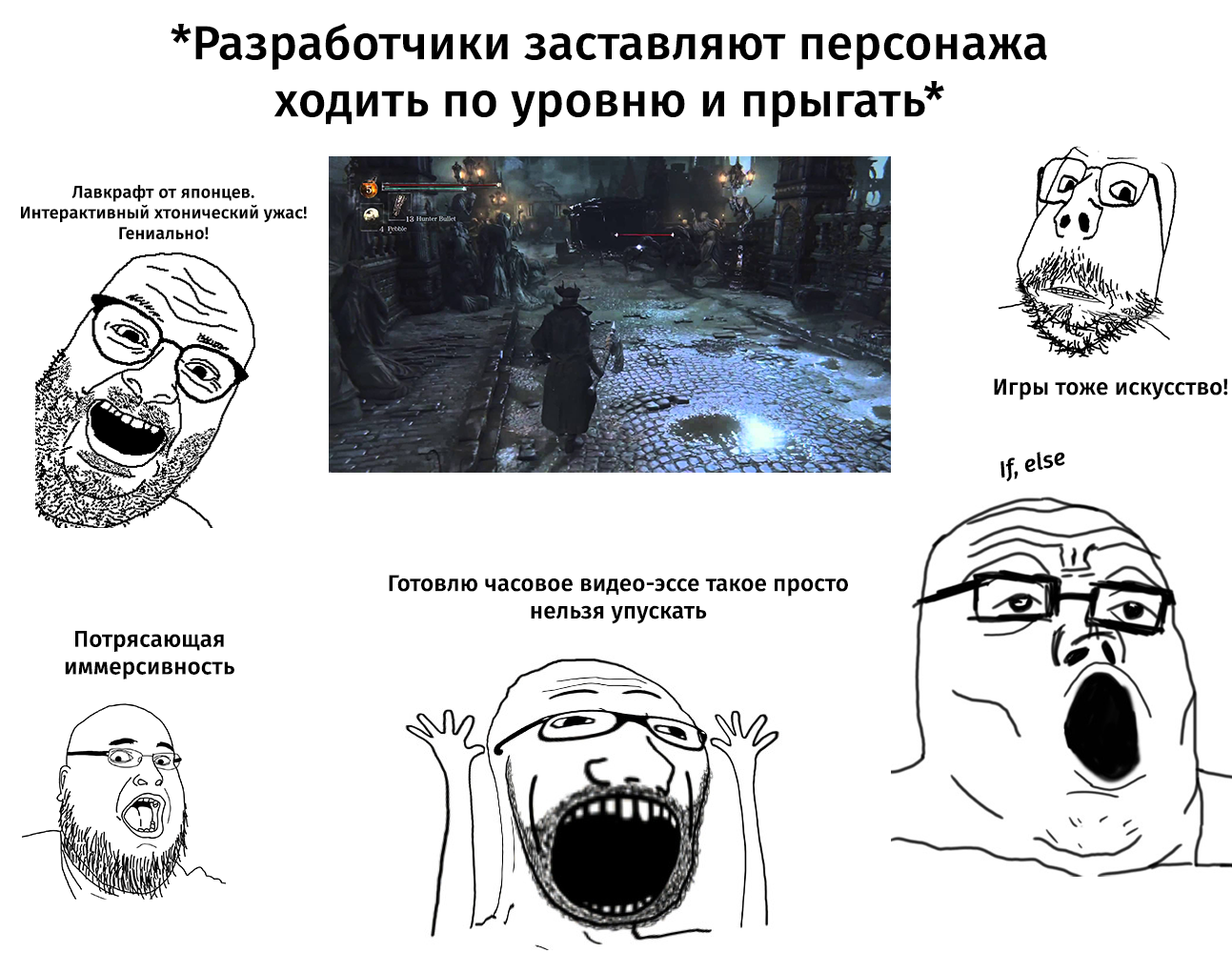 >>25314479 >>25314469 Бля, а я бы хотел обладать таким талантом, чтобы пиздеть ДВА ЧАСА об довольно хуевой игре. Я когда-то пытался делать ролики на Ютубе и написать сценарий, в котором была бы мысль чуть сложней "ну игра пиздатая, графон для своего время хорош, батя грит маладца. хуйня вот тут была, и тут. а так нормалек. я рекомендую под пиво" было ОЧЕНЬ тяжело. Типа, когда какой-нибудь Лейтер(который тогда ещё не сошел с ума) делал обыкновенные обзоры, но лил воды ебать как, вот сука как у этих людей это выходило? Мб нынешние эссеисты хотя бы джпти юзают, а раньше как? Только талант, только навыки с филологического.