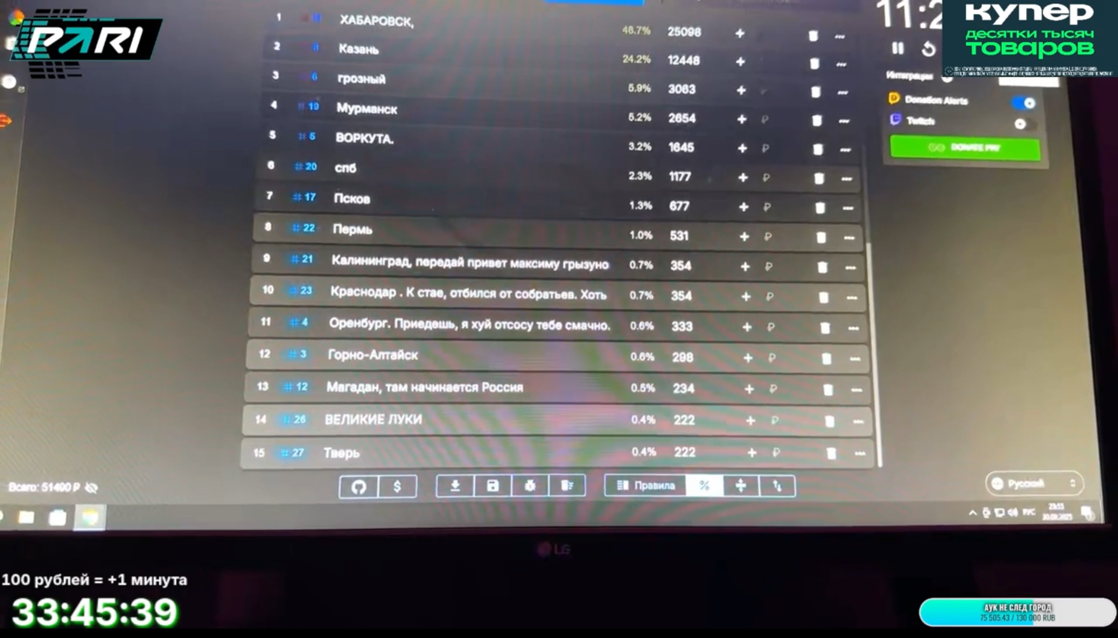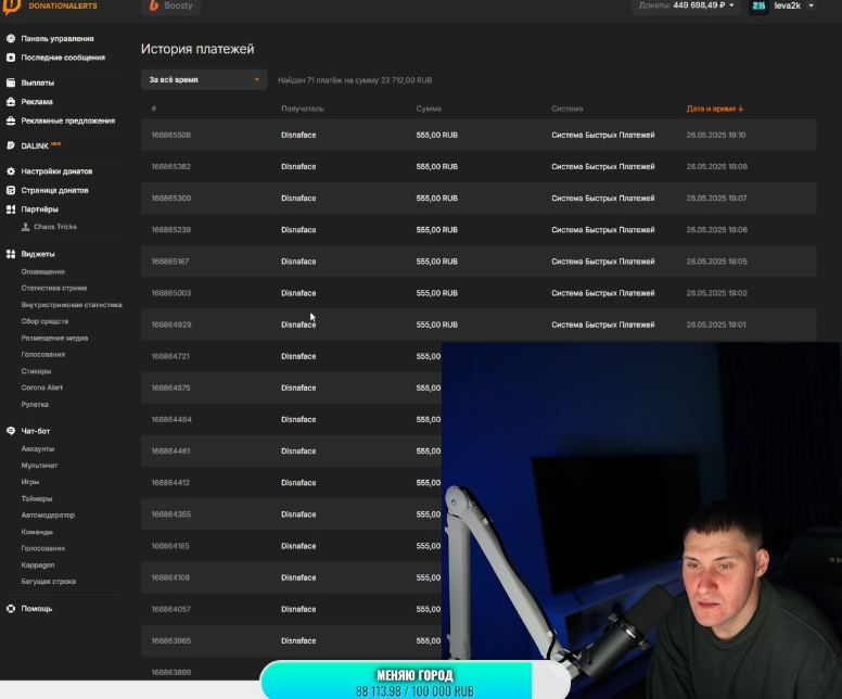 >>25291991 Больше половины самодонаты, что его аж корежит от цен на билеты, еще кто-то отмывает бабки через донаты, странно что несколько часов висело 20к донатов, а потом резко среди ночи когда все спят нахуярили 80к)) без палева так