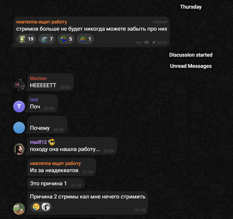 В основном у тянок стримерш вижу такую хуйню, им внезапно не хочется стримить они видите ли работу ищут и прочее, потом пройдут критические дни, у неё в голове сложится что лучше доить симпов чем работать на работе говна 12 часов и они возвращаются к стримингу через неделю-месяц