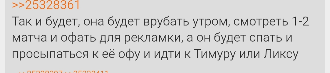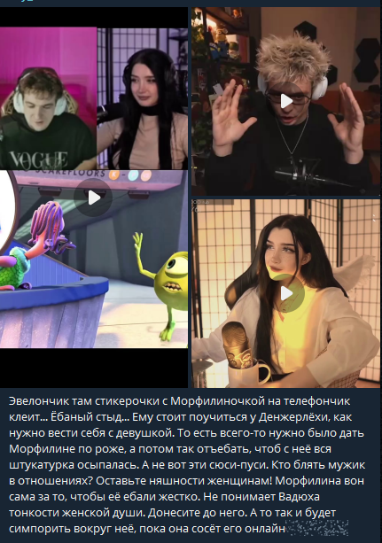 Последние 16 часов мониторил все тг паблики, чаты стримеров (Гая, Морфилина, Эвелон и др), анализировал стимы и вк, дискорды. Пришел к следующим выводам (уверен в них на 99%) 1. Фруктозка абсолютно точно больше не живет с десаутом 2. Кьютировер в активных поисках завозного популярного хуя, чтобы попадать в твичфм нарезки с шипом 3. Денжерлеша ебет морфи, предположительно будут совокупляться месяца 3-4, потом морфи будет дропнута и станет лесбиянкой 4. Морфилина возможно скоро отдастся эвелону. Тут проблема в том, что она очень стесняется своих гениталий (очень длинный щавель), боится реакции Вади и инста дропа. Так же предположительно у нее яишница на сосках. 5. Гаечка 11го октября не будет ночевать дома. Скоро выдам аналитику по слей номинациям.