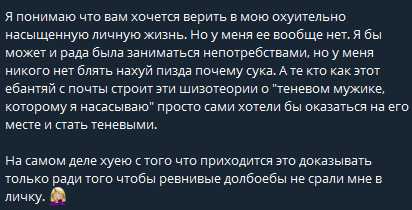 Максимально надеюсь, что малютка нахуй пошлет нищих симпов и начнет уже куролесить на полную - садо-мазо вечеринки, парни в масках облизывающие её ноги, фотосессии с голыми хуястыми неграми и т.п.