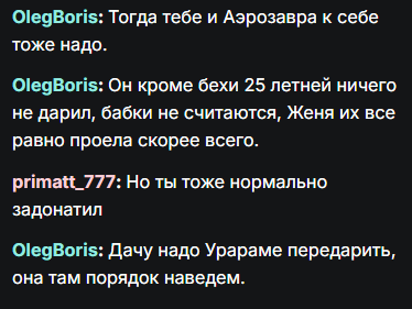 Ну вобщем какая-то пьяная каша по поводу возврата дачи у него - то он к нотариусу пойдет, она ему какой-то бланк даст, то пойдет в суд, то "будет отзыв дарения" потому что был под воздействием каких-то веществ, то потому что "есть видеосвидетельства (стримы с дачи), что Жене похуй на дачу"