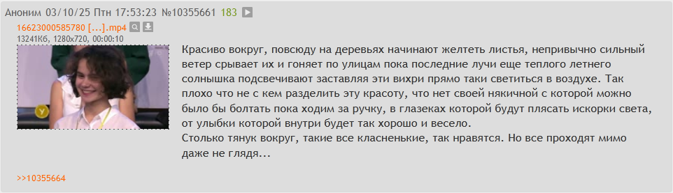 >>25339852 >Перечитай ветку, при чём тут кутить вообще. Ну мне каж есть очевидная разница между тем, када в башку себе, из сорок пятого калибра, стреляет человек, пресытившийся жизнью, и Вячеслав Курбатов, стреляющийся из кожаного пистолета, за шкафом. Или к чему тада конкретно как он? Мозги себе вышибал много кто.