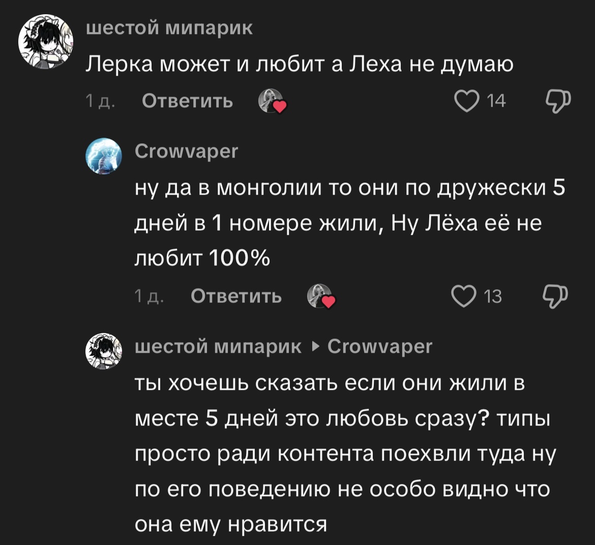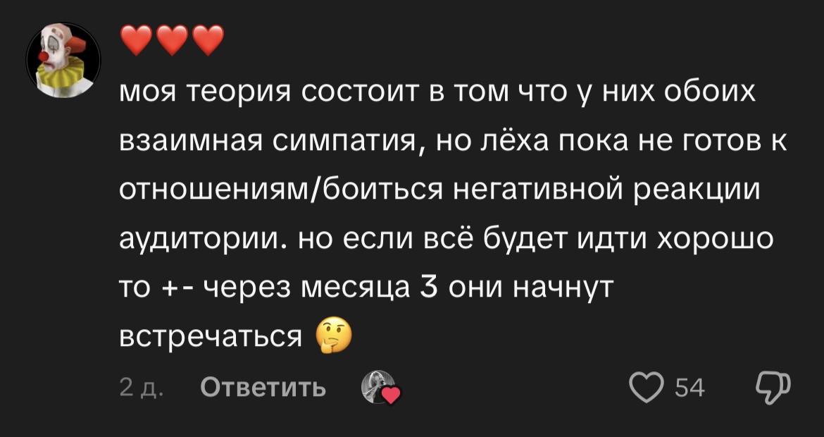 >>25357365 Ну и Леха в открытую нихуя не говорит изредка что-то вкинет невнятное в шутку и так же агрится на фмчиков в чате, тик токовских и коментах в ТГ где их шиперят, они одинаково реагируют на происходящее потому что договорились наверно сильно не распездывать про отношения но и выкидывают что-то что бы держать интерес