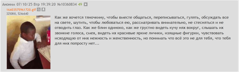 >>25357574 Бьёт по самооценке сильно, она и так у меня ниже ватерлинии. Потом весь вечер проведу в рефлексии. Слишком много отказов было. Не несколько тысяч, но с меня хватит. Помню, в /b/ пацанчик-омеган, который выкладывал запись разговоров с бабкой и мамкой, решил записывать свои подкаты в реале с фразами, которые ему аноны подсказали, к 100 разным бабам планировал подкатить. На первых нескольких десятках фейлов подряд забил.