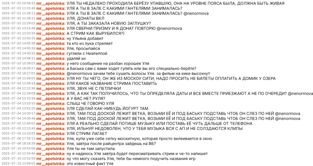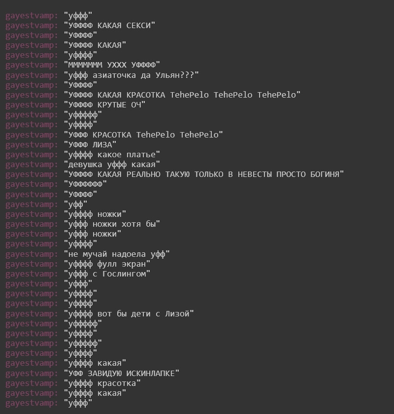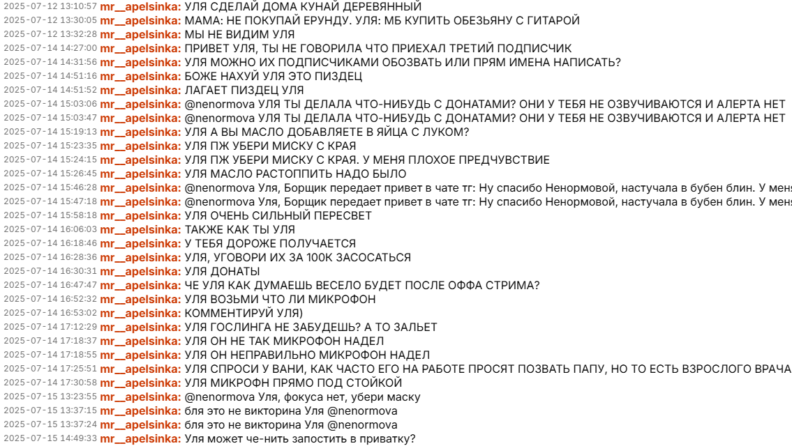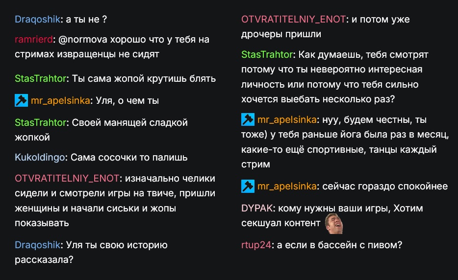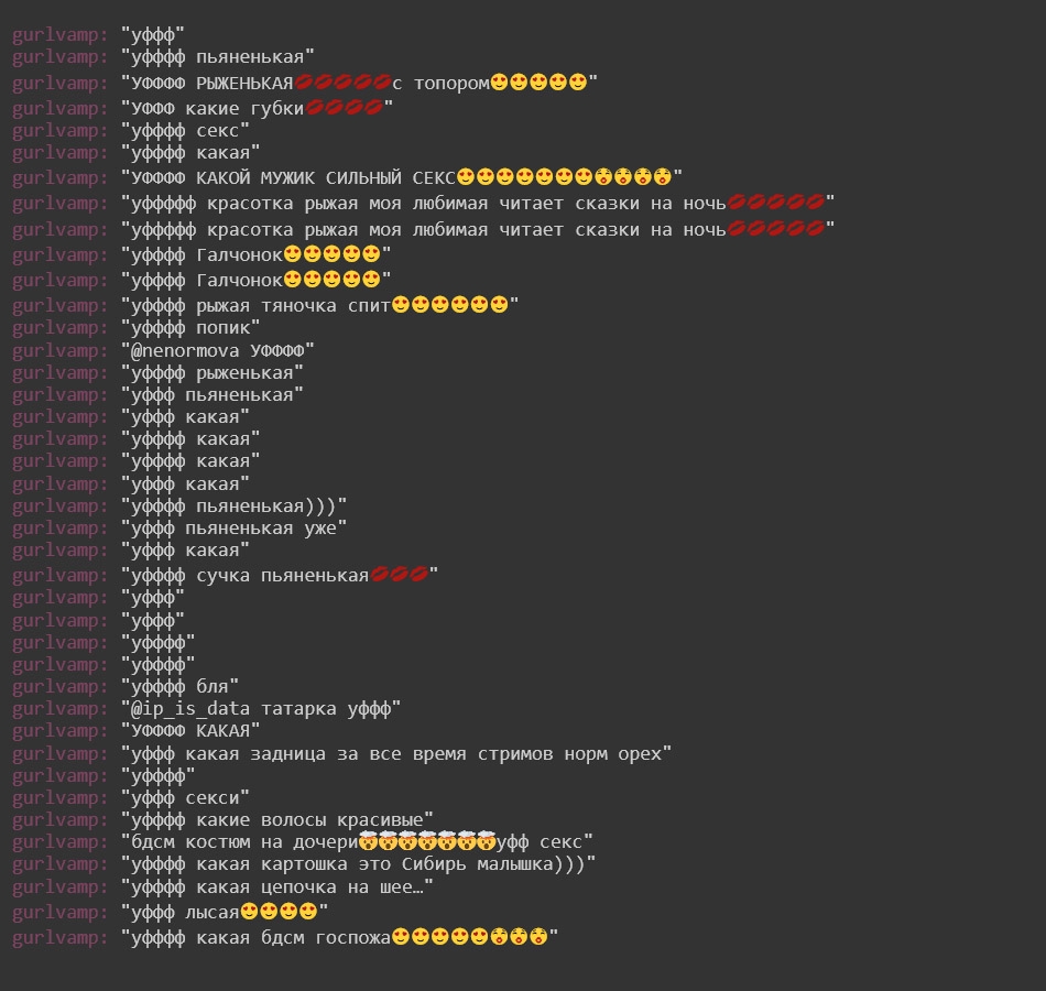 >>25366891 Нет. Она очень возмущалась, что все, включая Тимоху, ждут достаточного для лапания опьянения Ненормовой. За весь стрим она оставила около 400 сообщений. Включая такие, в течение 5 минут