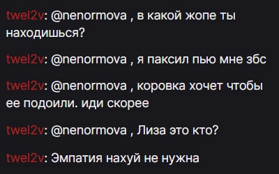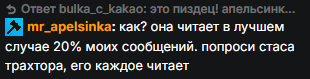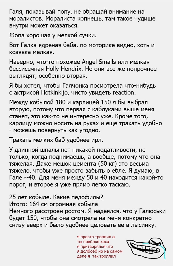 Ну всё, апельсинка, ты уже даже не во вторых рядах, уже задвинут на третьи, ты со своим гундежом, нравоучениями заебал полностью галку, ей приходится тебя терпеть просто ну типа дань памяти старому зрилу услужливому, думаю твоё дело ещё возможно её раскрутка в треде мэда, но там уже всё быстро трётся и даётся за такое бан на неделю. Ну твои хрупкие шансы по сути сошли на нет, ты ведь даже ссышься приехать к Гале чтоб оскуфевшую внешку с здоровенным шнобелем не засветить. Дальше продолжать симповать просто бесполезно, я бы на твоём месте выбрал петлю.... Иначе чего, ждёшь инфаркта от бана на канале nenormova и normova на катке? Это позорище, как в копипасте смерть задрота...