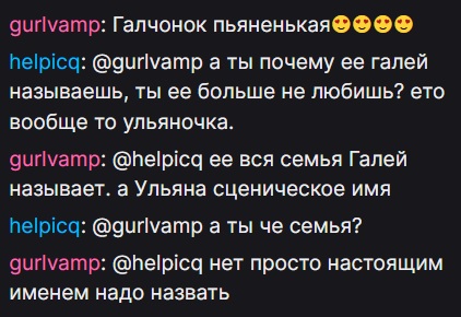 >>25367869 Про Галю в треде написано достаточно. И ее поведение не может оправдывать чужую дурость. Если только она прямо не попросила эту gurlvamp постить идиотский уфф-комплимент в чат время от времени.