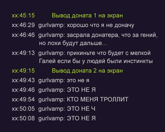 Допустим, от сообщения Насти в 46:29 до его прочтения шутником прошло 15 секунд. И тут же возникла идея отправить донат. Он его придумал, вбил ник, возможно заполнил формы и подтвердил кодом из смс. И на всё это ушло около минуты? Ведь отправлен он был где-то в 48:15, если учесть, что задержка между списанием денег и выводом на экран - минута минимум (у меня с карт меньше не было, за другие способы оплаты не ручаюсь). Интервал ровно в 4 минуты тоже подозрительный, но может в самом сервисе заданы какие-то чётные окна для удобства обслуживания. Имхо, оба доната от Насти