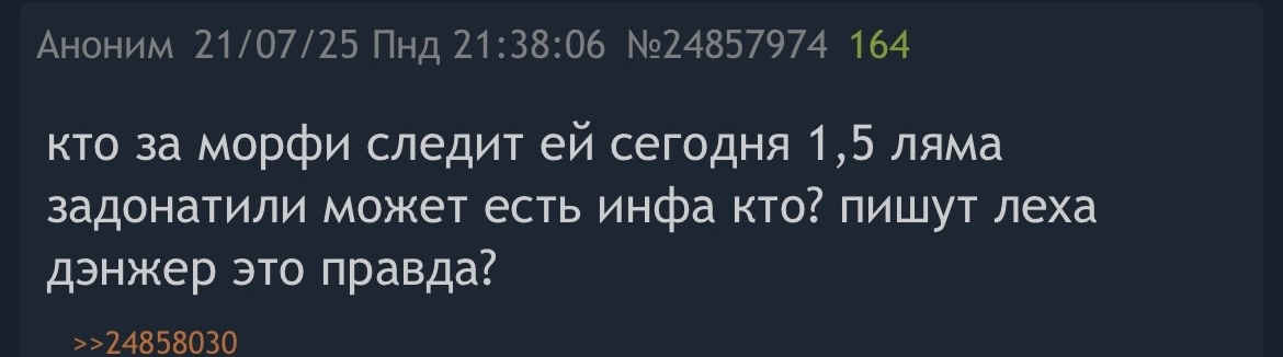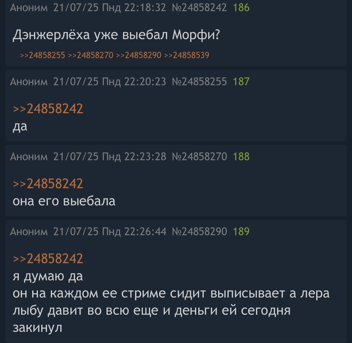 >>25387528 Помню как в августе тут писали что это на неделю и вообще денжер чед у него бывшая чуть ли не модель и ебать он будет только топовых оксанок а над морфи чисто угарает поэтому не воспринимаю твои обсеры