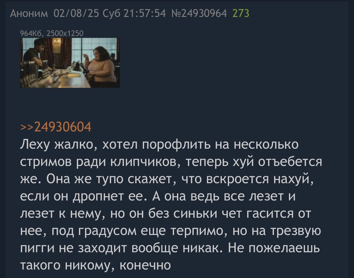>>25387873 это ваще мем ебаный, чел постоянно жаловался что она обижается на всякие обзывательства, ревнует к каждой женщине, радовался что она съебала в питер, говорил что все хуево стало еще за 2 месяца до дропа, пошел играть с морфой на следующий день после расставания, но с катькой определенно было лучше