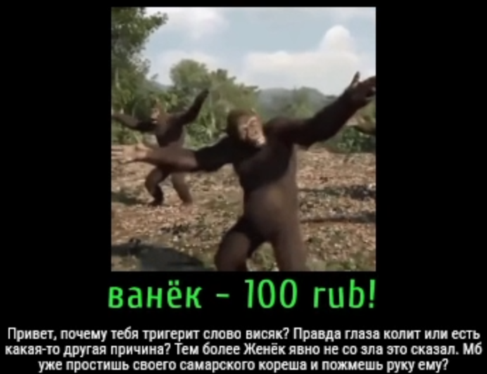 Зачем Евгений Невес сравнил условного чеченца с обезьяной? Он же сам на одном из стримов говорил что в холодном поту проснулся от того что к нему во сне ломились горные жители. Что за гниль самоубийственная? Сейчас подсос мэда тред расфорсит эту тему, и поставят Клепу нашего на колени то, и связи отцовские не помогут