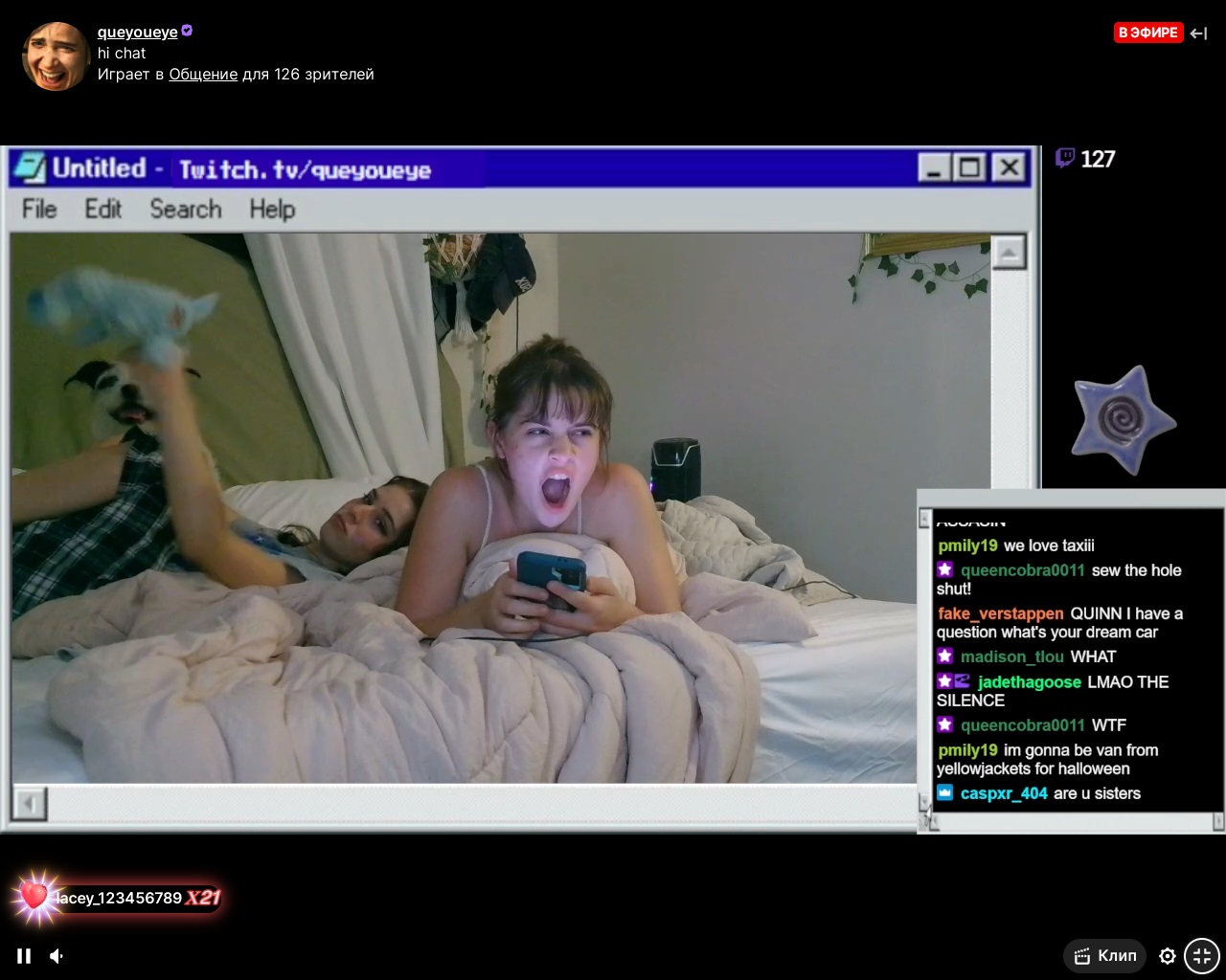 https://www.twitch.tv/queyoueye моя будущая американская жена 5 часов не затыкается, в то время, как наша ленивая солевуха максимум 3 часа выдерживала нализывания инцелов из чата и вырубала трансляцию, чтобы поскорее сосать хуи и упарываться наркотой